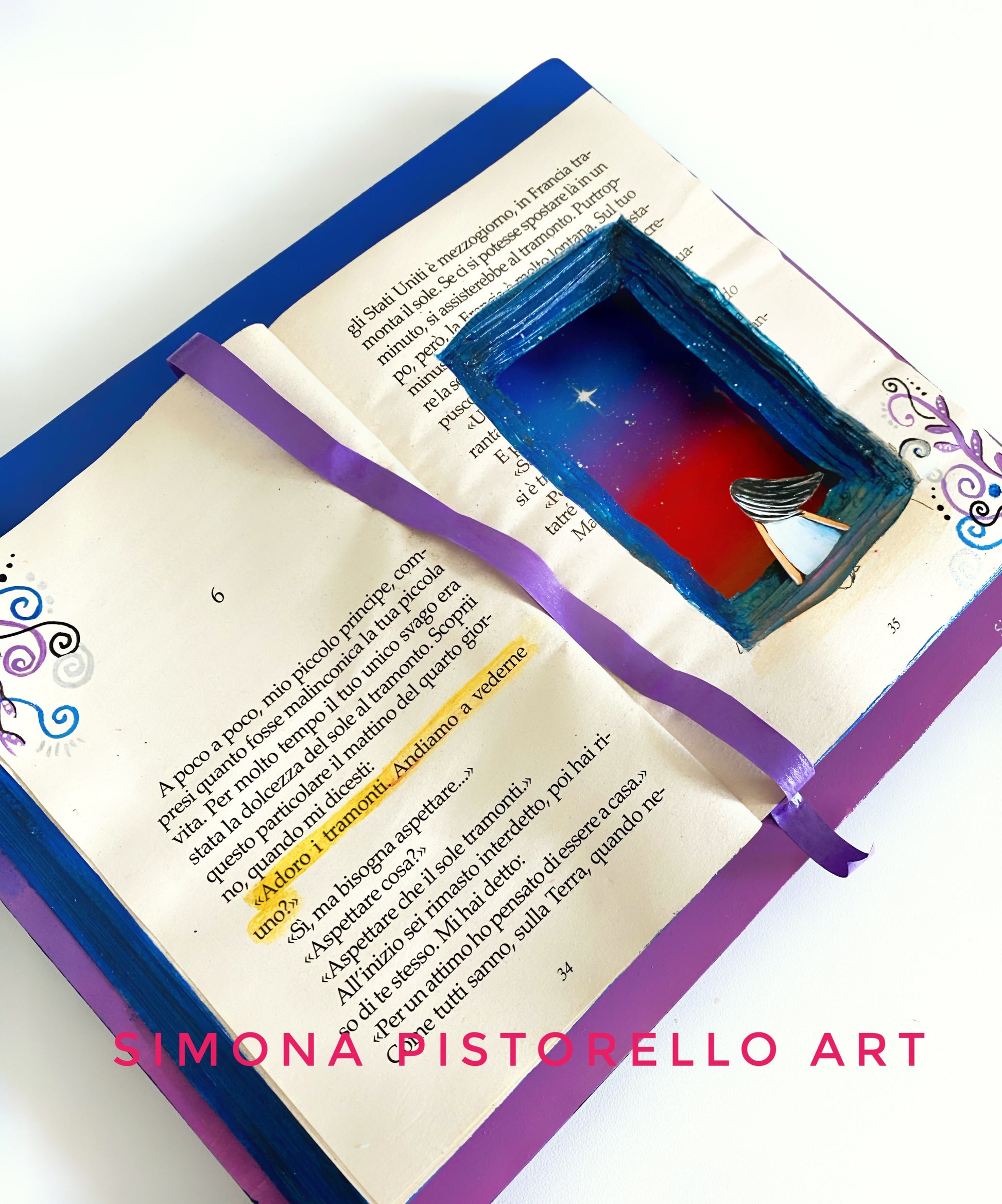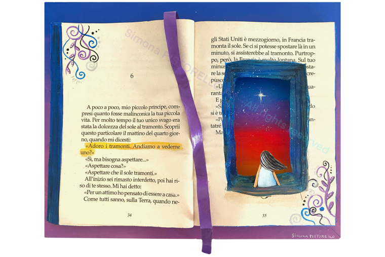 Un tramonto avvolge l'orizzonte con sfumature di rosso, arancione e viola. Il cielo, un vasto mosaico di colori caldi, accoglie il sole che scende lentamente dietro all'orizzonte. In primo piano, un libro, apparentemente consumato dal tempo. Le pagine ingiallite e consunte raccontano storie di vite vissute e mondi immaginati. Il libro, come un guardiano di memorie, è intriso di saggezza antica e di segreti sussurrati dal vento. Il tramonto, con la sua bellezza effimera, sembra rendere omaggio alla storia racchiusa tra le pagine, mentre l'opera si manifesta come un'ode alla fusione tra il passato e il presente, tra la natura e la creatività umana.